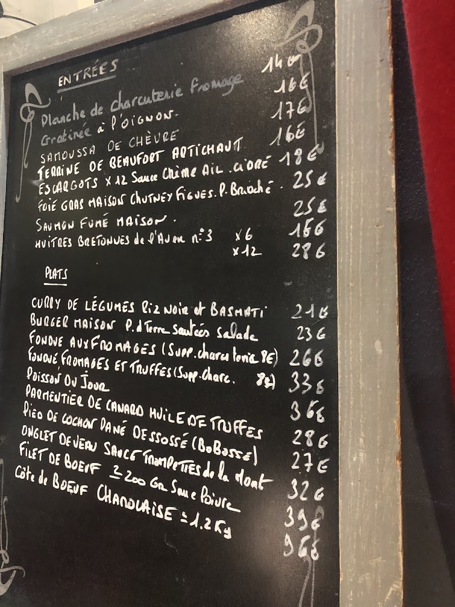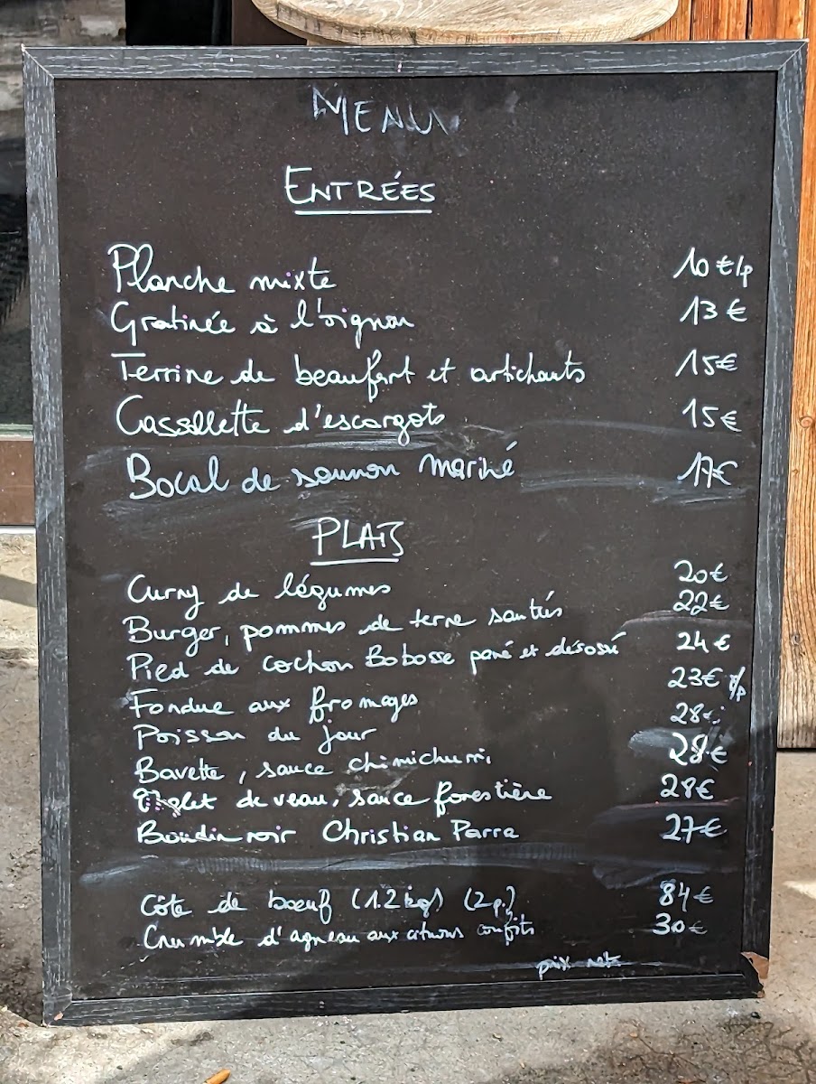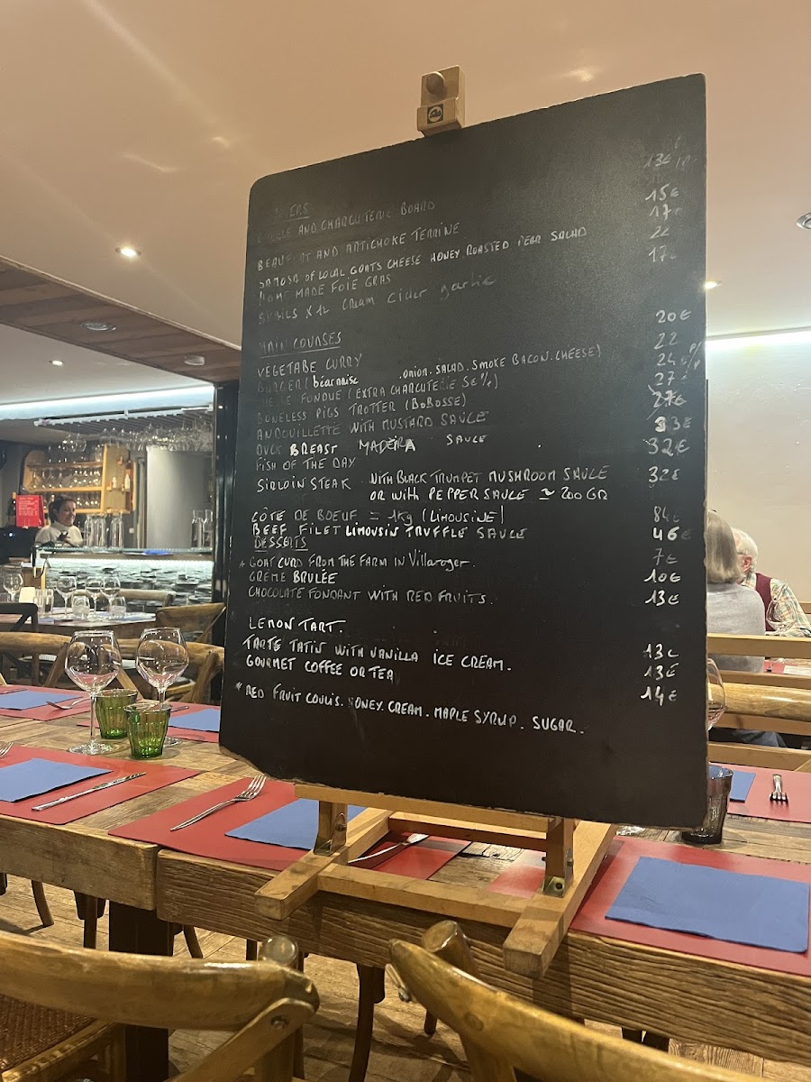 Moving to the mains, the Curry de légumes offers a vegetarian option, while the Burger served with sautéed potatoes and salad is a hearty favorite. The Fondue aux fromages comes with a salad, with an optional supplement of charcuteries (8 €) for extra flavor. Seafood lovers will appreciate the Noix de Saint Jacques meunière (x5) with sweet potato puree and roasted vegetables. The centerpiece of the menu is the impressive Côte de Boeuf Limousine (1kg), designed to be shared by two guests.
