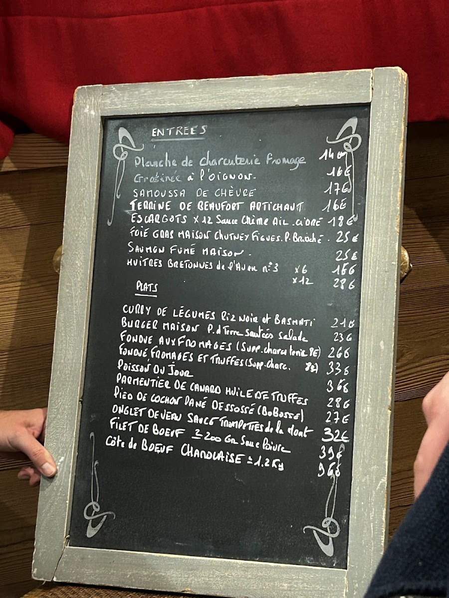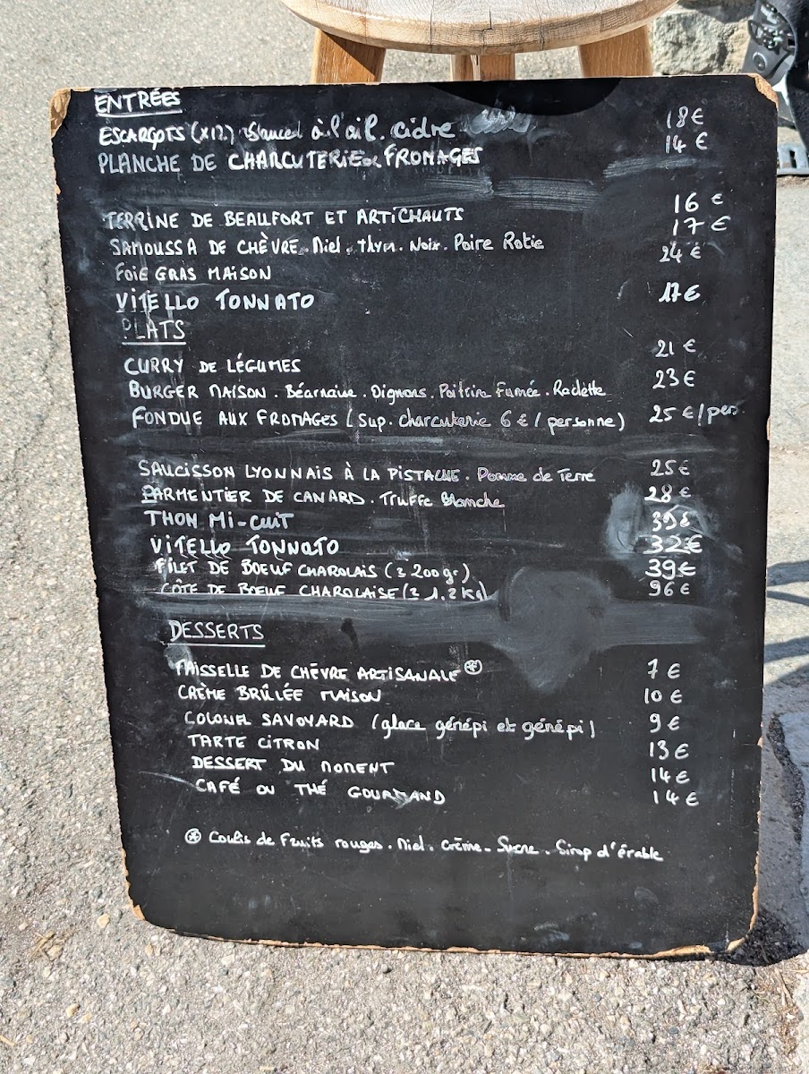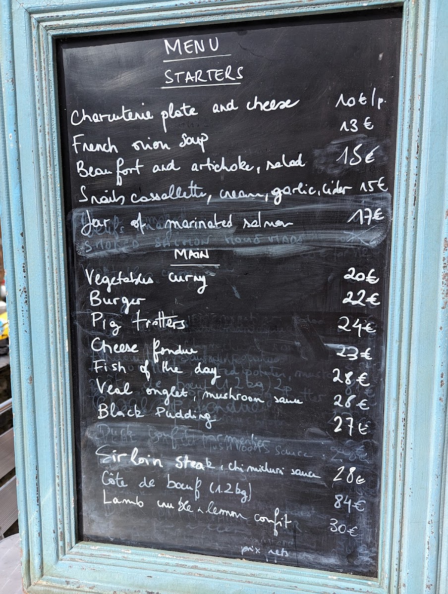 Moving to the mains, the Curry de légumes offers a vegetarian option, while the Burger served with sautéed potatoes and salad is a hearty favorite. The Fondue aux fromages comes with a salad, with an optional supplement of charcuteries (8 €) for extra flavor. Seafood lovers will appreciate the Noix de Saint Jacques meunière (x5) with sweet potato puree and roasted vegetables. The centerpiece of the menu is the impressive Côte de Boeuf Limousine (1kg), designed to be shared by two guests.